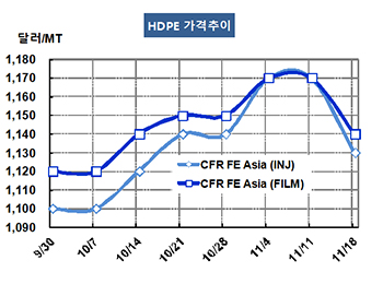 HDPE(High-Density Polyethylene)는 1200달러에 도달하지 못하고 폭락했다. HDPE 가격은 11월16일 Injection 및 Blow-Molding 그레이드 기준 CFR FE Asia 톤당 1130달러로 40달러 및 30달러 폭락했고 CFR SE Asia도 1140달러로 40달러 및 30달러, CFR S Asia 역시 1150달러로 40달러 및 30달러 떨어졌다. Film 그레이드도 FEA는 1140달러로 30달러, SEA도 1150달러로 30달러 폭락했고 SA는 1160달러로 20달러 하락했으며, Yarn 그레이드는 FEA가 1160달러, SEA는 1170달러로 30달러 폭락했다. 표, 그래프 : < HDPE 가격추이 > <화학저널 2016/11/21> |