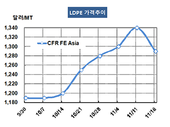 LDPE(Low-Density Polyethylene)는 폭락세로 전환됐다. LDPE 가격은 11월16일 CFR FE Asia 톤당 1290달러로 50달러 폭락했으나 CFR SE Asia는 1280달러로 변동이 없었다. 표, 그래프 : < LDPE 가격추이> <화학저널 2016/11/21> |