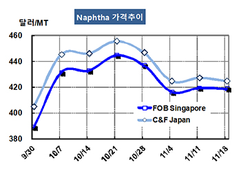 나프타(Naphtha)는 국제유가와 반대로 흐르고 있다. 나프타 가격은 11월18일 CFR Japan 톤당 425달러로 2달러 하락한 반면 FOB Singapore도 419달러로 1달러 상승했다. 표, 그래프 : < Naphtha 가격추이 > <화학저널 2016/11/25> |