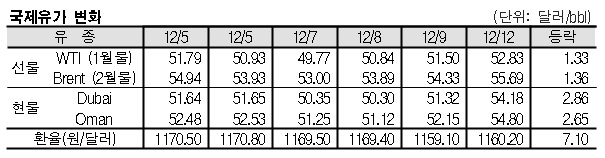 12월12일 국제유가는 OPEC(석유수출국기구) 비회원국의 감산 동참, OPEC 감산량 확대 가능성, 미국 달러화 약세 등으로 상승했다.