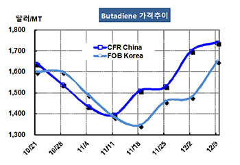 부타디엔(Butadiene)은 폭등에 이어 또 상승했다. 부타디엔 가격은 12월9일 FOB Korea 톤당 1680달러로 30달러 상승했고 CFR SE Asia도 1690달러로 40달러 올랐다. CFR China 역시 40달러 급등해 1740달러를 형성했다. 표, 그래프 : < Butadiene 가격추이 > <화학저널 2016/12/13> |