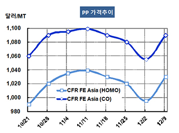 PP(Polypropylene)는 폭등세로 돌변했다. PP 가격은 12월7일 Raffia 및 Injection 그레이드가 CFR FE Asia 톤당 1030달러로 35달러 폭등했으나 CFR SE Asia는 1010달러로 10달러, CFR S Asia 역시 1025달러로 15달러 상승에 그쳤다. BOPP는 FEA가 1015달러로 10달러, SEA도 1020달러로 10달러, SA는 1045달러로 20달러 상승했다. 표, 그래프 : < PP 가격추이 > <화학저널 2016/12/13> |