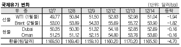 12월14일 국제유가는 미국 달러화 강세, OPEC(석유수출국기구)의 11월 생산량 증가 등으로 하락했다.