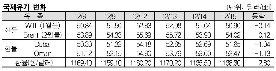 12월15일 국제유가는 중동 산유국의 감산 이행 계획 등으로 상승했다. 12월15일 국제유가는 중동 산유국의 감산 이행 계획 등으로 상승했다. 표, 그래프: <국제유가 변화> <화학저널 2016/12/16> |