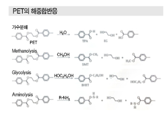 PET는 가수분해로 PTA(Purified Terephthalic Acid), Methanolysis로 DMT(Dimethyl Terephthalate), Glycolysis로 BHET(Bis-2-Hydroxy Ethyl Terephthalate), Aminolysis로 테레프탈아미드(Terephthalamide) 유도제품이 생성되며 모든 해중합을 통해 EG가 생성된다.