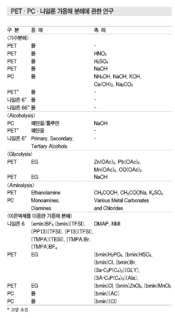 아울러 EG 용매 속에서 PET를 알칼리 가수분해함으로써 테레프탈산나트륨염(Na2-TPA)으로 분리·회수하는데 성공한 사례도 있다.