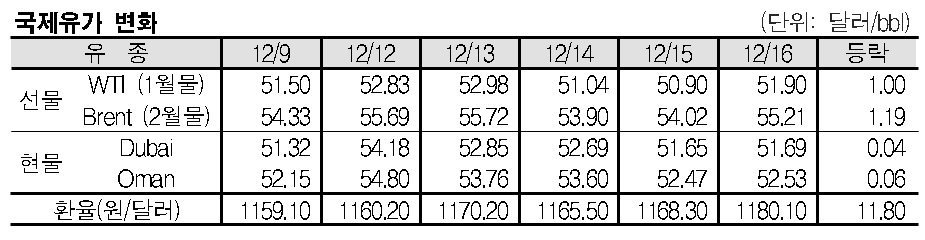 12월16일 국제유가는 러시아의 감산 계획 발표 및 투자은행의 국제유가 전망치 상향 등으로 상승했다.