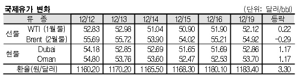 12월19일 국제유가는 미국 원유 재고 증가 및 달러화 강세 등으로 하락했다.