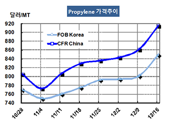 프로필렌(Propylene)은 갑자기 폭등했다. 프로필렌 가격은 12월16일 FOB Korea 톤당 849달러로 48달러 폭등했고 CFR SE Asia는 801달러로 150달러 폭등했다. 표, 그래프 : < Propylene 가격추이> <화학저널 2016/12/20> |