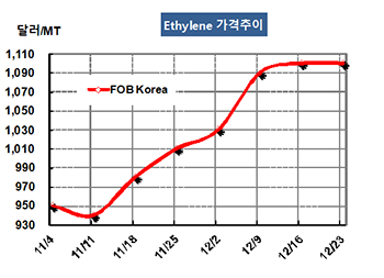 에틸렌(Ethylene)은 하락세를 나타냈으나 움직임이 미미했다. 에틸렌 가격은 12월23일 FOB Korea는 형성되지 않았고 CFR NE Asia는 톤당 1140달러로 5달러 하락했고 CFR SE Asia도 985달러로 10달러 떨어졌다. FOB Korea는 12월16일 1100달러로 10달러 상승했었다. 표, 그래프 : < Ethylene 가격추이 > <화학저널 2016/12/26> |