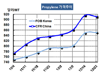 프로필렌(Propylene)은 약상승에 그쳤다. 프로필렌 가격은 12월23일 FOB Korea 톤당 851달러로 2달러 상승했고 CFR China는 910달러로 5달러 하락했다. CFR SE Asia는 거래가 없어 형성되지 않았다. 표, 그래프 : < Propylene 가격추이 > <화학저널 2016/12/27> |