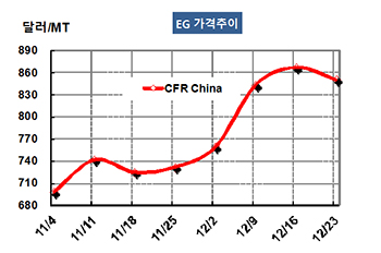 MEG(Monoethylene Glycol)는 꼭대기에서 미끄러졌다. MEG 가격은 12월23일 CFR China 톤당 850달러로 17달러 하락했고 CFR SE Asia는 거래가 끊어짐에 따라 형성되지 않았다. 표, 그래프 : < EG 가격추이 > <화학저널 2016/12/27> |