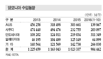 시장 관계자는 “국내 암모니아 수입은 오스트레일리아와 사우디 의존도가 높았으나 2015년에는 인도네시아, 말레이지아 등 동남아를 중심으로 수입선이 다변화됐다”며 “미국이 셰일가스 생산을 확대해 수출국으로 전환한 것도 주목된다”고 강조했다.