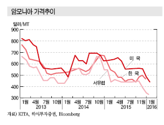 시장 관계자는 “글로벌 공급과잉으로 암모니아 가격이 하향 안정화되고 있다”며 “암모니아 가격은 2016년 하반기에도 300달러 후반에서 400달러 초반에서 변동이 없을 것”이라고 예상했다.