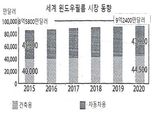 가식‧장식 필름은 자동차용 수요가 증가세를 나타내 성장을 지속할 것으로 예상되고 있다. 표, 그래프: <세계 윈도우필름 시장 동향> <화학저널 2017/01/04> |