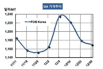 SM(Styrene Monomer)은 초강세의 부담을 이겨내지 못했다. SM 가격은 12월30일 FOB Korea 톤당 1170달러로 10달러 하락했고 CFR SE Asia는 현물가격이 형성되지 않았다. CFR China는 1197달러를 형성했다. 표, 그래프 : < SM 가격추이 > <화학저널 2017/01/04> |