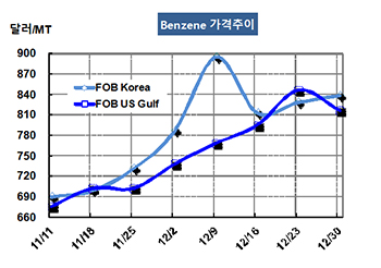 벤젠(Benzene)은 800달러대 중반으로 올라섰다. 벤젠 가격은 12월30일 FOB Korea 톤당 838달러로 9달러 상승했고 FOB SE Asia 역시 840달러로 올라섰다. 그러나 CFR Taiwan은 형성되지 않았다. 표, 그래프 : < Benzene 가격추이 > <화학저널 2017/01/04> |