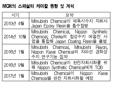 표, 그래프: <MCH의 스페셜티 케미칼 동향 및 계획> <화학저널 2017/01/06> |
