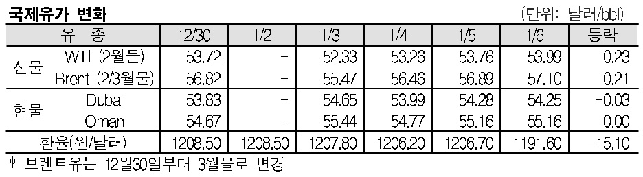 1월6일 국제유가는 OPEC(석유수출국기구) 감산 합의 이행 지속 등으로 상승했다. 1월7일 국제유가는 OPEC이 감산 합의 이행을 지속함에 따라 상승했다. 표, 그래프: <국제유가 변화> <화학저널 2017/01/09> |