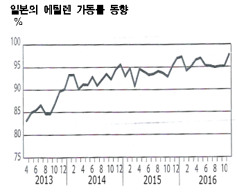 표, 그래프: <일본의 에틸렌 가동률 동향> <화학저널 2017/01/09> |