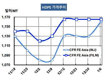 HDPE(High-Density Polyethylene)는 일부 그레이드가 급등했다. HDPE 가격은 Injection 그레이드 기준 1월4일 CFR FE Asia 톤당 1160달러로 30달러 급등했고 CFR SE Asia도 1180달러로 30달러 올랐다. CFR S Asia는 1190달러로 50달러 폭등했다. Blow-Molding 그레이드는 SEA만1175달러로 25달러 급등했고, Film 그레이드는 SA만 1180달러로 30달러 급등했다. 표, 그래프 : < HDPE 가격추이> <화학저널 2017/01/09> |