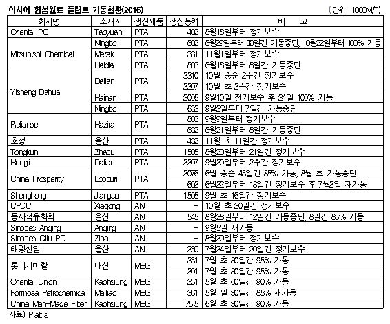 표, 그래프: < 아시아 합섬원료 플랜트 가동현황(2016) > <화학저널 2017/01/12> |