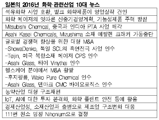 일본은 2016년 화학 시장이 호조를 나타낸 가운데 새로운 시대에 대응하기 위한 움직임이 활발했던 것으로 파악되고 있다. 일본은 2016년 Mitsubishi Chemical이 인디아와 중국 PTA(Purified Terephthalic Acid) 사업의 매각을 결정했고 Asahi Kasei Cemicals가 Mizushima 소재 에틸렌 크래커의 가동을 중단하는 등 석유화학 산업의 구조개혁이 이루어졌다. 표, 그래프: <일본의 2016년 화학·관련산업 10대 뉴스> <화학저널 2017/01/13> |