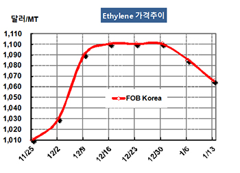 에틸렌(Ethylene)은 하락세를 지속하고 있다. 에틸렌 가격은 1월13일 FOB Korea 톤당 1065달러로 20달러 하락했으나 CFR SE Asia는 1005달러로 25달러 상승했다. CFR NE Asia는 1110달러로 20달러 떨어졌다. 표, 그래프 : < Ethylene 가격추이 > <화학저널 2017/01/16> |