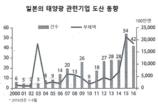 한화케미칼(대표 한창범)은 중소규모의 태양광발전 관련기업들이 도태됨에 따라 시장을 장악할 것으로 예상되고 있다. 표, 그래프: <일본의 태양광 관련기업 도산 동향> <화학저널 2017/01/20> |