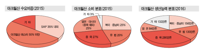 아크릴산은 아크릴산 에스터용이 수요의 절반, SAP용이 35%를 차지하고 있는 것으로 파악되고 있다.