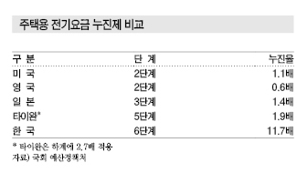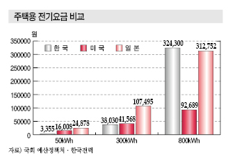 에너지 대부분을 수입하고 있는 일본과 비교해도 사용량이 50kWh일 때 일본이 한국보다 4.9배 비싸나 200kWh로 4배 늘면 한국은 1만9750원으로 5배 이상 늘어나는 반면 일본은 4만9203원으로 3배 늘어나는데 그치고 있다. 300kWh와 400kWh 구간에서는 일본이 한국보다 더 부과하지만 600kWh부터는 역전돼 한국이 높은 것으로 분석되고 있다.