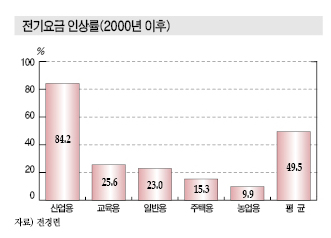 전경련은 2000년 이후 15차례 걸친 전기요금 인상을 통해 전체 전기요금이 평균 49.5% 인상된 가운데 주택용은 15.3%, 일반용은 23.0%, 산업용은 84.2% 올랐다고 주장했다.