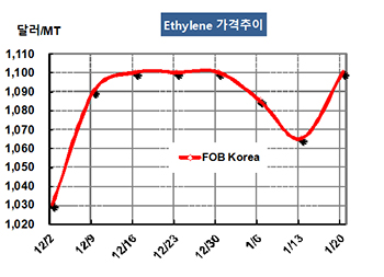 에틸렌(Ethylene)은 상승세로 반전했다. 에틸렌 가격은 1월20일 FOB Korea 톤당 1100달러로 35달러 급등했고 CFR SE Asia도 1035달러로 30달러 올랐다. 특히, CFR NE Asia는 1170달러로 70달러 폭등해 4개월만에 최고치를 형성했다. 표, 그래프 : < Ethylene 가격추이 > <화학저널 2017/01/23> |