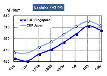 나프타(Naphtha)는 오랜만에 하락세로 전환됐다. 나프타 가격은 1월20일 CFR Japan 톤당 513달러로 8달러 하락했고 FOB Singapore 역시 504달러로 8달러 떨어졌다. 표, 그래프 : < Naphtha 가격추이> <화학저널 2017/01/23> |