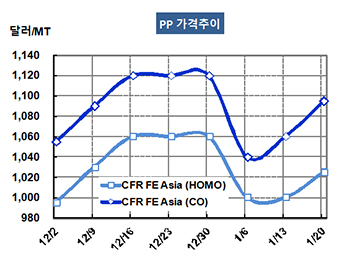 PP(Polypropylene)는 갑자기 급등했다. PP 가격은 1월18일 Raffia 및 Injection 그레이드 기준 CFR FE Asia 톤당 1025달러로 25달러 상승했으나 CFR SE Asia는 1045달러로 5달러 오르는데 그쳤다. IPP Film 및 BOPP도 FEA는 1045달러 및 1035달러로 25달러 급등했으나 SEA는 1065달러로 5달러 올랐다. Block Copolymer 역시 FEA는 1095달러로 35달러 폭등했으나 SEA는 1110달러로 10달러 상승에 그쳤다. 표, 그래프 : < PP 가격추이 > <화학저널 2017/01/24> |