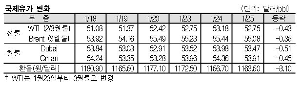 1월25일 국제유가는 미국의 원유 및 석유제품 재고 증가, 미국 원유 생산량 증가 등으로 하락했다.