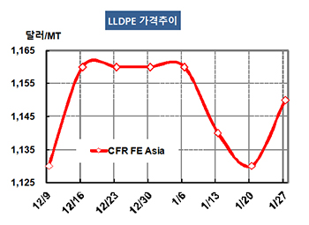 LLDPE(Linear Low-Density Polyethylene)는 상승세를 지속하고 있다. LLDPE 가격은 1월25일 CFR FE Asia 톤당 1150달러로 20달러 상승했고 CFR SE Asia도 1170달러로 20달러 올랐다. 표, 그래프 : < LLDPE 가격추이 > <화학저널 2017/01/31> |
