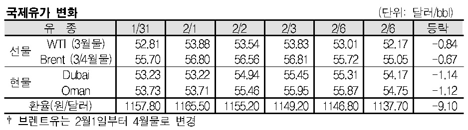 2월7일 국제유가는 미국 원유 생산 증가 전망 및 중국의 석유 수유 증가세 둔화, 미국 달러화 강세 등으로 하락했다. 2월7일 국제유가는 미국의 원유 생산 증가 전망 등으로 하락했다. 표, 그래프: <국제유가 변화> <화학저널 2017/02/08> |