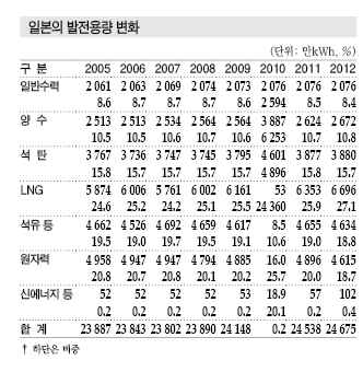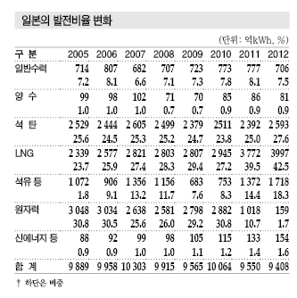 원자력 발전량은 2010년 2882억kWh에서 2012년 159억kWh로 2723억kWh 감소한 반면 가스화력 발전량은 2945억kWh에서 3997억kWh로 1052억kWh, 석유 등은 753억kWh에서 1718억kWh로 965억kWh 증가했다.