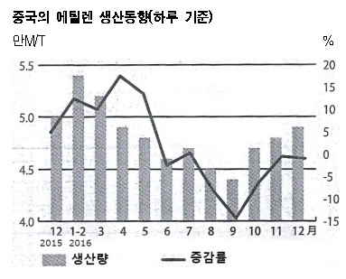 표, 그래프: <중국의 에틸렌 생산동향(하루 기준)> <화학저널 2017/02/20> |
