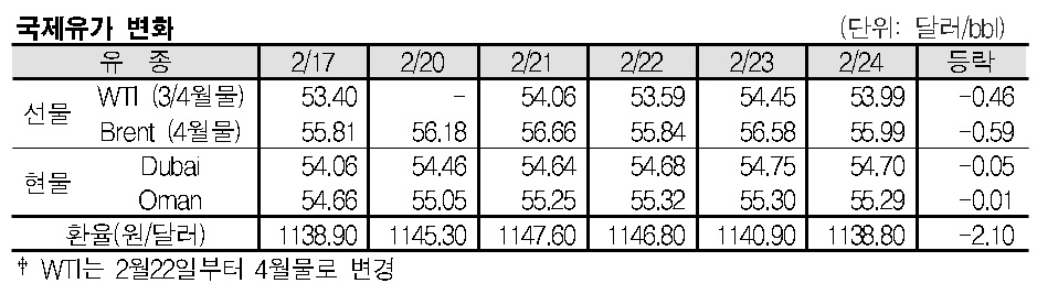 2월24일 국제유가는 미국 원유 시추리그 수 증가 및 미국 공급량 증가, 미국 달러화 강세 등으로 하락했다. 2월24일 국제유가는 미국 원유 시추리그 수 증가 등으로 하락했다. 표, 그래프: <국제유가 변화> <화학저널 2017/02/27> |