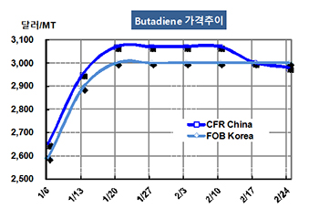 부타디엔(Butadiene)은 하락세가 다시 주춤해지고 있다. 부타디엔 가격은 2월24일 FOB Korea 톤당 3000달러로 변동이 없었고 CFR SE Asia도 2950달러로 보합세를 나타냈다. 다만, CFR China는 2980달러로 20달러 하락했다. 표, 그래프 : < Butadiene 가격추이 > <화학저널 2017/02/28> |