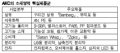 표, 그래프: <AKC의 소재영역 핵심제품군> <화학저널 2017/03/03> |