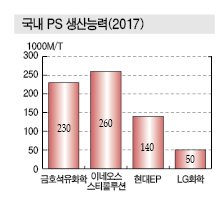 국내 PS(Polystyrene) 시장은 정부가 구조조정을 요구하고 있으나 대부분이 기존 생산체제를 고수하고 있다. 표, 그래프 : <국내 PS 생산능력(2017)> <화학저널 2017년 3월 6일> |