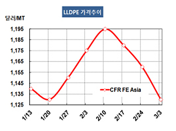 LLDPE 가격은 3월1일 CFR FE Asia 톤당 1130달러로 30달러 급락했고 CFR SE Asia는 1150달러로 40달러 폭락했다. 다만, CFR S Asia는 1190달러로 10달러 하락에 그쳤다.