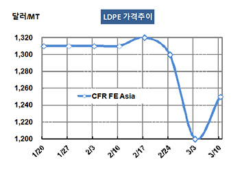 LDPE 가격은 3월8일 CFR FE Asia 톤당 1250달러로 50달러 폭등했으나 CFR SE Asia는 1300달러로 변동이 없었다.