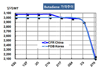 부타디엔(Butadiene)은 대대적으로 폭락했다. 부타디엔 가격은 3월10일 FOB Korea 톤당 2100달러로 800달러 폭락했고 CFR SE Asia도 2100달러로 750달러 떨어졌다. CFR China 역시 750달러 폭락해 2150달러를 형성했다. 표, 그래프 : < Butadiene 가격추이 > <화학저널 2017/03/14> |