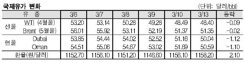 3월13일 국제유가는 미국 셰일오일(Shale Oil) 생산 증가 전망 및 미국 금리 인상 가능성 등으로 하락했다. 3월13일 국제유가는 미국 셰일오일 생산 증가 전망 등으로 하락했다. 표, 그래프: <국제유가 변화> <화학저널 2017/03/14> |