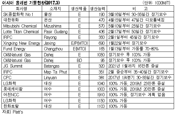 대한유화가 디보틀넥킹을 위해 NCC(Naphtha Cracking Center)를 장기간 가동중단할 방침이다. IRPC는 Rayong 소재 에틸렌 35만톤 크래커를 2월1일부터 45일간 정기보수하며 Map Ta Phut 소재 에틸렌 35만1000톤 크래커도 2월 중순부터 35-40일간 정기보수할 계획이다. <화학저널 2017/03/20> |