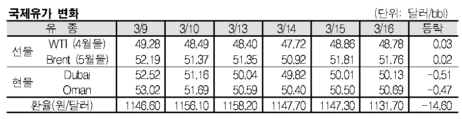 3월18일 국제유가는 사우디의 감산 기간 연장 시사 발언 및 미국 달러화 약세 등으로 상승했다. 3월17일 국제유가는 사우디의 감산 기간 연장 시사 발언 등으로 상승했다. 표, 그래프: <국제유가 변화> <화학저널 2017/03/20> |